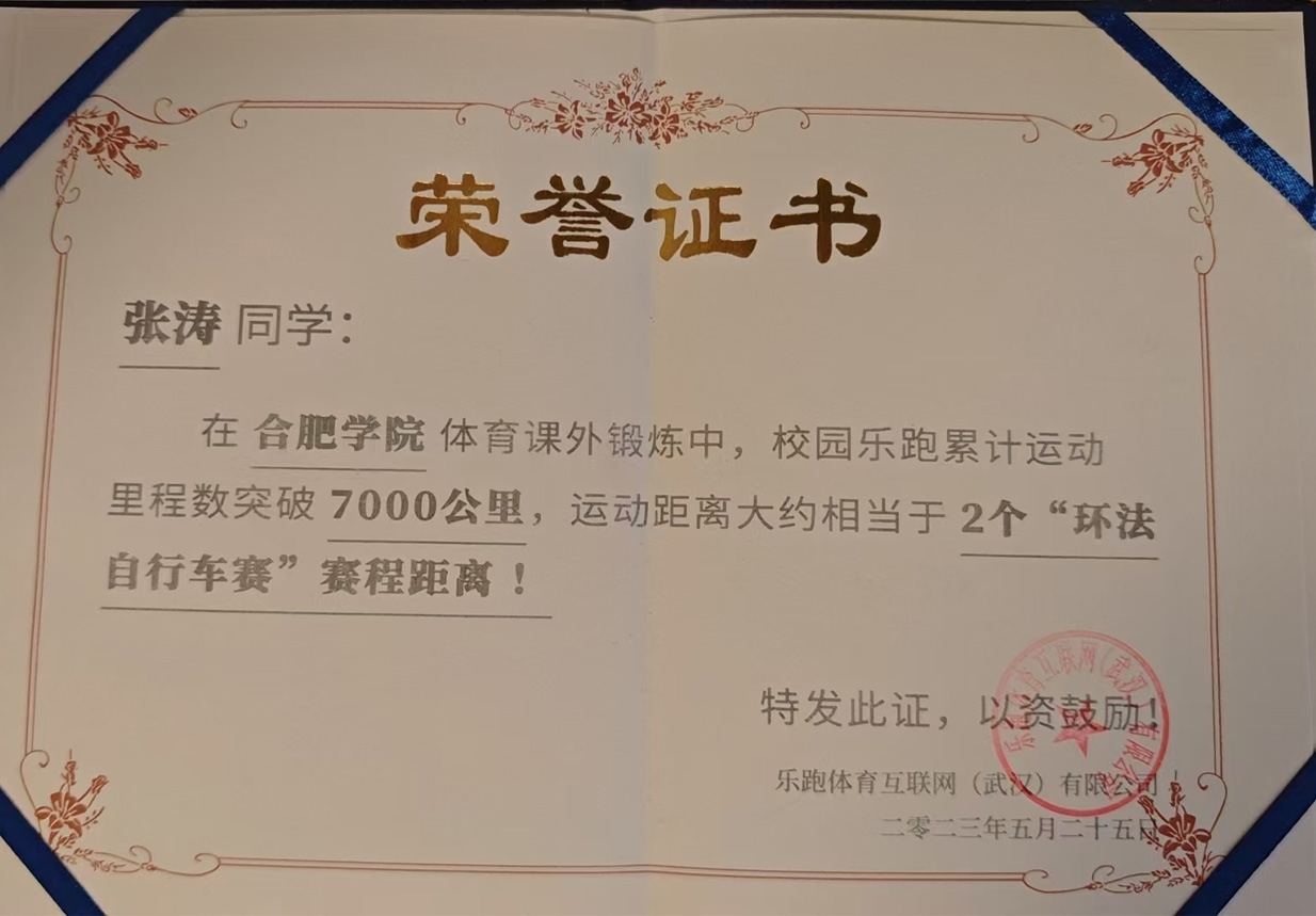 2018-2022年本科期间,参加校园乐跑活动获得全国第二排名,总计一万公里